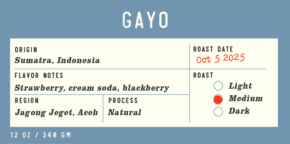 This coffee was grown in the Jagong Jeget sub-district of Central Aceh, in the Aceh province of Sumatra. The area is home to nearly 9,500 people, of which approximately 70% come from Java while the remaining 30% is comprised of people of various ethnic groups, including Gayo, Aceh, and Malay. Almost 90% of people living in Jagong Jeget earn income through agricultural work, particularly Arabica production, which flourishes here due to the region’s rich black humus soil and elevation of 1400–1600 meters above sea level.