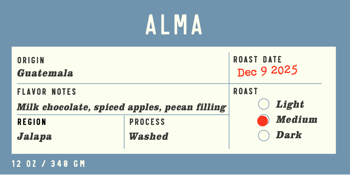 A sustainable sourcing approach is similar to our strategy as farmers and sellers: everything has a home. From the 88+ COE submissions to the 82 point mill-outs and last picks sold to local consolidators, there's value. Our intention with Alma involves sourcing bright, fruited coffees of 84.5+ quality-- coffees with a lot of soul -- with our vendor partners from Huehue to Jalapa. Our QC team based in Guatemala is meticulously selecting for a consistent, clean, and lightly fruity blend. La Alma means the Soul, and we hope this blend will be the vitality and warmth of your espresso or house coffee.