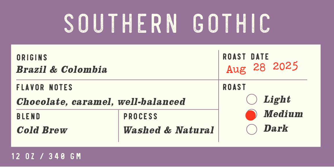 It’s literary. It’s Southern. It’s dark. But we’re not talking about Flannery O’Connor, William Faulkner or Cormac McCarthy. Southern Gothic is warm, comfort coffee at its best. We chose to start offering this as our in-house cold brew because it’s a great, darker-roasted, low-acid blend. Think heavier body, rich full chocolates and caramels. The kind of coffee anybody can enjoy.